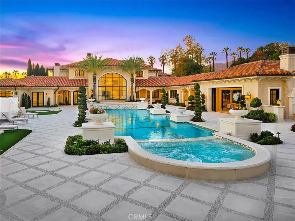 Tucked behind the guarded gates of the coveted Bradbury Estates, this remarkable Tuscan-inspired compound offers an exceptional level of privacy on more than two acres of meticulously maintained grounds. A stately drive framed by mature palm trees introduces a residence that exemplifies refined craftsmanship, architectural grandeur, and uncompromising luxury. Encompassing more than 14,000 square feet of living space, the estate is richly appointed with bespoke finishes and artisan materials sourced from Italy. Interiors feature dramatic marble inlaid flooring, custom-designed carpets, richly detailed wall coverings, coffered and domed ceilings, sculpted wall treatments, marble base moldings, and museum-quality chandeliers. A sophisticated home automation system and independent energy capabilities seamlessly integrate modern innovation with timeless design. The formal entry leaves a lasting impression with a magnificent Murano glass chandelier, soaring two-story ceiling, intricate laser-cut marble inlays, and elegant Lalique crystal accents complemented by silk wall coverings. Expansive living spaces flow effortlessly, with the formal living room capturing picturesque views of the mosaic-tiled outdoor pool and grounds beyond. Every bedroom suite is individually curated, offering luxurious finishes, custom chandeliers, and spa-like marble bathrooms. The estate is further distinguished by an extraordinary collection of amenities, including an indoor swimming pool, expansive indoor-outdoor entertaining spaces, a separate guest residence with two ensuite bedrooms and kitchenette, a private executive office with conference lounge, a fully equipped fitness center, and an impressive car barn. Rarely does a property of this caliber become available, offering a serene resort-style lifestyle, exceptional privacy, and architectural excellence in one of Southern California’s most exclusive communities.
