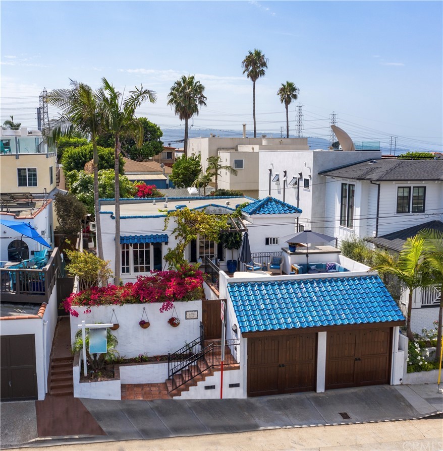 Highly updated, yet true to it’s 1928 build date, this quintessential Spanish bungalow blends timeless California charm with the ease of modern living. With its unbeatable location atop the Hermosa Hill and signature blue-tile roof, it’s no wonder this house is considered a favorite in the community. This home takes advantage of ocean views while offering plenty of coveted outdoor space and a rare Bonus ADU for flexible living space. The gated entryway immediately welcomes you to a secluded, sunken courtyard on one side, then steps up to a secondary deck with ocean and mountain views. The large backyard features a raised redwood deck with built-in seating and overhead trellis, making it a perfect retreat to cozy-up and enjoy a glass of wine after entertaining outdoors on the spacious, Spanish tile paved patio area. A beautifully updated Accessory Dwelling Unit offers a cozy living/sleeping area, a colorful kitchenette, and a 3/4 bath with clawfoot tub. The perfect get-away for guests or a home office! The home itself offers 2 bedrooms, each with custom California Closets organizers, and an updated bath finished in the contemporary “wet room” style. The light and bright kitchen is delightful with its recently added quartz countertops, designer tile flooring, and marble backsplash, which accent the craftsmanship of the original glass-faced cabinetry. The home is equipped with a Culligan water softener, spacious laundry room, and lots of storage. This home epitomizes the Southern California lifestyle, with ample outdoor entertainment space, historic charm, and a central location to the beach, local schools, and everyday conveniences. (SF doesn't include Bonus ADU)