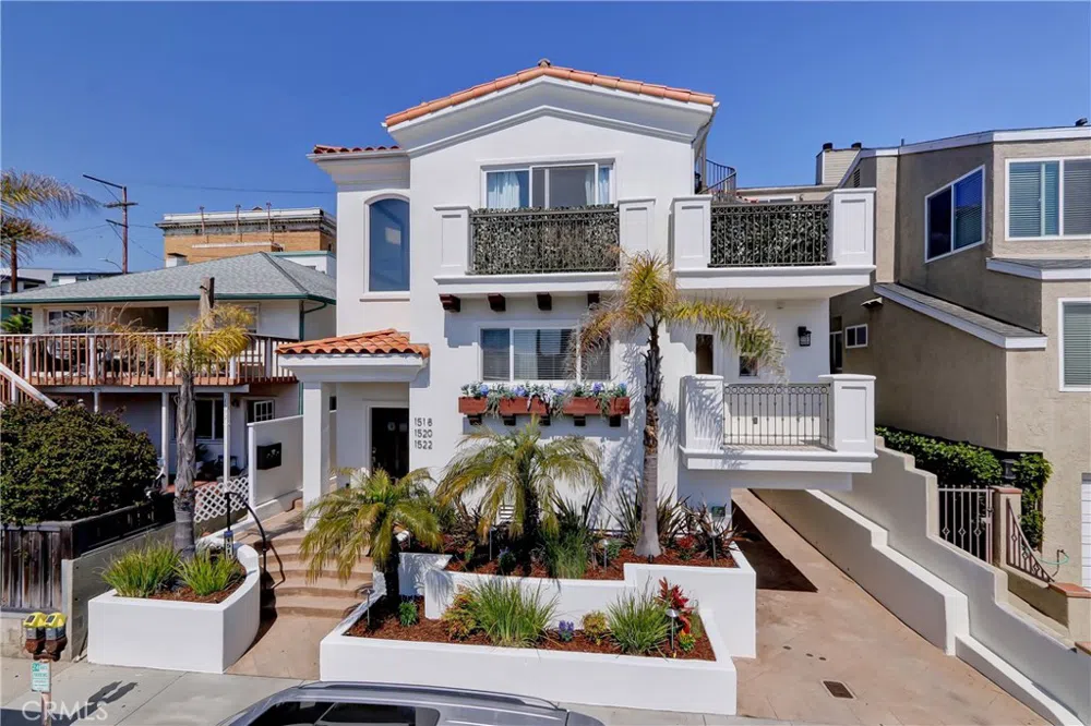 This stunning middle unit of three Townhomes is located just one block away from the beach, on the outskirts of downtown. Enjoy breathtaking panoramic ocean views from the roof deck, perfect for entertaining guests. The interior has been beautifully remodeled down to the studs, featuring new white oak wide plank hardwood floors and stunning two-toned cabinetry in the kitchen with brushed gold hardware, a glinting mother of pearl backsplash and white quartz "marble" counters. A complete array of stainless steel appliances adorn this culinarily social kitchen with wraparound peninsula seating. The open great room is surprisingly bright; awash in natural light from massive windows and skylights, and offers a perfectly situated California casual dining area. Cozy up next to the corner fireplace inside or step outside onto the spacious BBQ deck for al fresco dining. The roof deck is like a "sky-yard" with beautiful panoramic views to downtown, the Pier and the Beach. The massive primary bedroom is a true retreat, complete with a spectacular bath featuring a separate tub and shower, dual lavs, and gorgeous porcelain "stone", plus a walk in closet. Private laundry room. The 2-car garage has amazing 14 foot high ceilings, perfect for a storage loft, man cave, or car lifts!! Don't miss out on this incredible opportunity to own this very special slice of heaven in the most central Hermosa Beach location! Park the car and walk, everywhere you want to be to immerse yourself in a wonderful beachside lifestyle. --