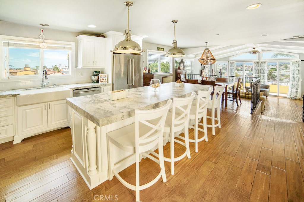 Perched on a hill on prestigious and quiet Speyer Lane, tucked away from busy and noisy streets, this magnificent custom home has a commanding presence and UN-OBSTRUCTABLE views from roof deck, living room, dining and kitchen (lots east and south sit significantly lower). Short 13-17 minutes drive to LAX. Dramatic open plan with views throughout! 4 homes east of the Hermosa Beach border. Finally a 4 bedroom Golden Hills/Jefferson School home that offers over 2600 square feet of living space! Situated just steps from Hermosa Beach you can live the good life in this California Spanish Coastal 4 bedroom, 3.5 bathroom single family home. Located in the Award winning Jefferson School District of Redondo this designer perfect home is complete with a remodeled kitchen with new Dolomite counter tops, Restoration Hardware lighting over center island, Farmhouse sink, subway tile backsplash, Viking stove, and refinished cabinets. Distressed hardwood floors throughout the home (except baths). Amazing craftsmanship staircase with gorgeous wrought iron railings. Large spa like master suite with separate tub and shower, dual sink vanity and walk in closet. Light and bright with views of the city from the main floor living area this home screams perfection. Complete with a large 4th bedroom or bonus play room that opens directly to a private hardscaped back yard. Kids have their own getaway - a custom built medieval tree-house/ castle. Do not miss the roof top deck off the kitchen offering outdoor living with views of South Bay all the way to Palos Verdes. Attached 2 car garage. All this located a 5 minute drive from one of the best beaches in the USA! See the youtube video for a complete walk-thru. Ceilings heights: 11ft - Living room, 12ft - Master Bedroom, 11ft - baby bedroom, 9ft - 2 bedrooms. The property is also for sale. Photos show the home occupied. Home is rented empty - with no furniture. Does include all appliances in photos.