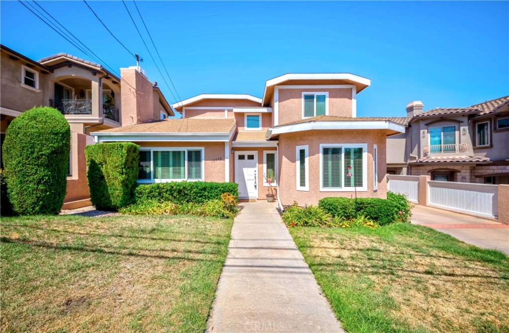 Bright and airy large front home for lease on a nice quiet street. Feels like a single family home, only 1 common wall of garage shared with a back neighbor. Walk into nice hardwood floored living room with vaulted ceiling and mantled fireplace. Separated formal dining room over looking beautifully landscaped front yard. Spacious kitchen with garden window over sink, tile counter top, white cabinets, and large eating area. Family room with access to side yard and attached 2-car garage. Convenient downstairs powder room with quartz vanity. Second floor primary bedroom with large walk-in closet, separate A/C, and access to private 20' x 20' roof top deck. Primary bathroom suite with dual sinks and separate shower and tub. Large additional 2 bedrooms with closets and a hallway bathroom. Upstairs hallway laundry area with washer & dryer. Central A/C. Close to the beach, shopping and dining. Within Redondo Unified School district.