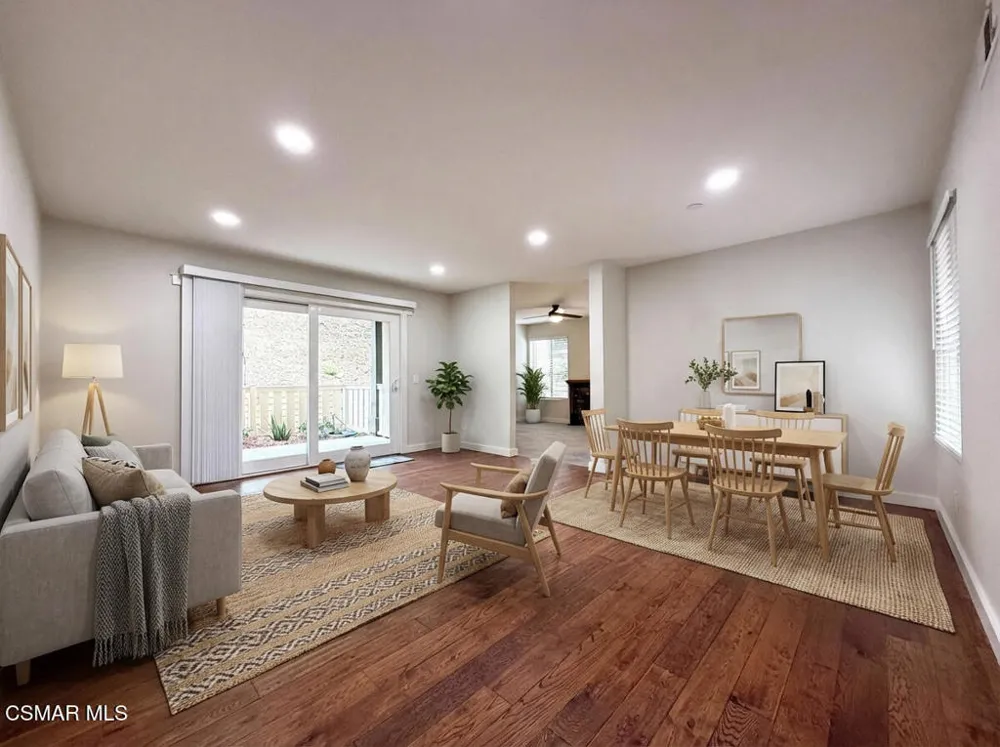 One of the premier locations within the serene Oaknoll Villas 55+ community, this beautifully remodeled 2-bedroom, 2-bath ground-level residence offers the ideal blend of comfort, convenience, and indoor-outdoor living. The home features a sprawling private patio, perfect for year-round entertaining, dining, or simply relaxing in a peaceful setting. Inside, the updated kitchen shines with quartz countertops, a sleek subway tile backsplash, and new range, microwave, and dishwasher. The versatile floor plan provides two generous spaces that can be configured as living and dining areas to suit your lifestyle. Down the hall, you'll find a full guest bathroom and a spacious guest bedroom highlighted by an oversized window with views of the private patio. The primary en-suite offers a beautifully remodeled bathroom with a large glass shower/tub combo, shaker-style vanity, and a conveniently located stacked washer and dryer. The Oaknoll community offers an impressive array of amenities, including a pool and spa, clubhouse, fitness center, library, BBQ area, shuffleboard courts, gardens, dog park, and more. Ideally situated in Thousand Oaks and centrally located near The Oaks Mall, Janss Marketplace, and a wide selection of shopping, dining, and everyday conveniences. A rare opportunity to enjoy resort-style living in one of Thousand Oaks' most desirable communities.