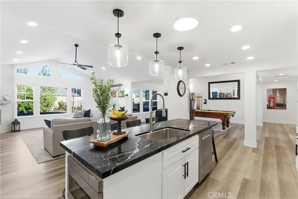 This beautifully updated single-story home offers 4 bedrooms, 2 bathrooms, and nearly 2,200 square feet of thoughtfully designed living space, combining modern upgrades with a highly functional layout. The heart of the home is the fully remodeled kitchen (November 2025), featuring quartz countertops, slow-close shaker-style cabinetry, and stainless steel appliances, including a gas range, dishwasher, microwave drawer, and ice maker. The kitchen opens seamlessly to a spacious living room, a permitted addition that creates an ideal setting for everyday living and entertaining. Stylish vinyl flooring runs throughout the home, complementing the oversized primary suite and generously sized secondary bedrooms, all expanded as part of a permitted addition. Both bathrooms have been tastefully updated with quartz countertops and custom tile showers, offering a clean, modern aesthetic. The home is equally impressive behind the scenes, featuring owned solar panels that fully offset energy usage with no true-up bill with SCE—even with an electric vehicle—while still allowing capacity for additional demand. A whole-house fan enhances comfort by efficiently drawing in cool coastal breezes during the morning and evening hours. The private backyard is a true entertainer’s retreat, complete with a custom BBQ bar, fire pit with built-in seating, and ample space for al fresco dining, lounging, or recreational enjoyment. A rare combination of style, efficiency, and seamless indoor-outdoor living, this turnkey residence offers a refined lifestyle in a beautifully upgraded setting. PLUS, this property is less than a mile from the beaches, boats, and summer concerts on Lake Mission Viejo, and it is zoned for the award-winning schools of Capistrano Unified.