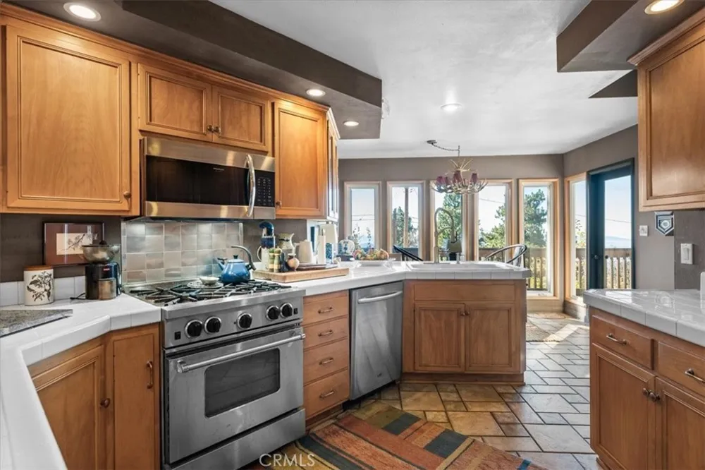 Welcome to this Charming Mountain TURNKEY Retreat, offering a Private Yard, Scenic Views from Two Decks, and the rare benefit of only One Neighboring Property. This well-designed SINGLE-LEVEL HOME features 1,886 sq. ft., 3 Bedrooms, 2 Bathrooms, a 7,280 SQ FTY Lot, and a 2-Car Garage. Step inside to an Open Floor Plan highlighted by a Spacious Living Room with a Fireplace, Custom Mantel, and Large Windows that frame beautiful mountain views. The Kitchen is thoughtfully appointed with Stainless Steel Appliances, Updated Cabinetry, Tile Countertops, and a separate Breakfast Nook with views. Adjacent to the kitchen is a Formal Dining Room—ideal for gatherings and entertaining. The Primary Bedroom Suite is privately situated away from the other bedrooms and offers Direct Access to a Secluded Patio surrounded by mature trees. The Remodeled En-Suite Bathroom features Double Sinks and a Custom Tub and Walk-in Shower. A Second Bedroom includes Direct Deck Access and is tastefully finished with Custom Window Coverings and a Ceiling Fan. The Third Bedroom is currently used as an office and includes Built-In Cabinets and Shelving for Storage. The Centrally Located guest Bathroom has also been beautifully Remodeled and includes a Walk-In Shower. Additional features include Wood Ceilings, Stone Flooring, Newer Carpet, Updated Windows, Custom Paint, and Seagrass Wallpaper. Ideally located in Running Springs, this home is just minutes from local shops, restaurants, hiking trails, and Snow Valley Mountain Resort. Whether you’re seeking a vacation getaway, rental opportunity, or full-time mountain residence, this exceptional home is truly one of a kind.