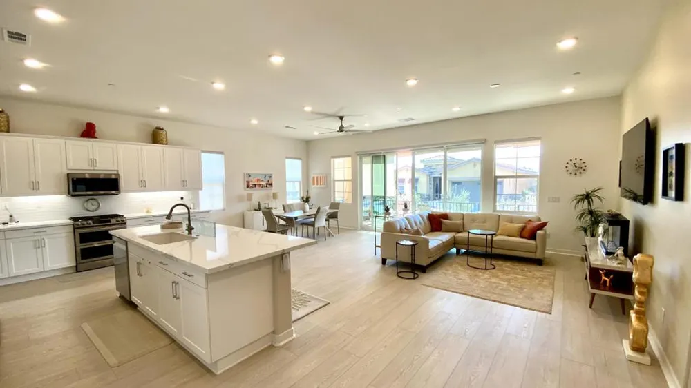 This extensively upgraded, south-facing, free-standing elegant Milano floor plan welcomes you with a dramatic formal entry and an expansive open-concept design. Located in Villa Portofino which is a highly sought-after 55+ gated community, in the heart of beautiful Palm Desert. The home features 2 bedrooms, 2 custom baths plus powder room, and two versatile flex rooms ideal for a den, office, or hobby space. The spacious Great Room with high ceilings flows seamlessly into the dining area and gourmet kitchen, creating an ideal setting for both everyday living and entertaining.The chef's kitchen features high end stainless steel appliances, custom quartz countertops, a full custom tile backsplash, and a large center island with a single-basin sink. Large walk-in pantry and lots of storage cabinetry. The Great Room, dining area, and Primary Suite all enjoy south-facing exposure with panoramic mountain views.The Primary Suite is highlighted by a spa-like bath with a freestanding luxury soaking tub, dual vanities with quartz countertops, an oversized walk-in shower, and a generous walk-in closet. The guest bedroom is bright and welcoming and is conveniently located adjacent to the guest bath.Additional highlights include high-end luxury vinyl plank flooring throughout, recessed lighting, custom window treatments, a separate laundry room, tankless water heater, leased solar, and a garage mini-split A/C. Outdoor features include a paver driveway & patios, colorful custom landscaping in both the front and back, and pet-friendly fencing for the side and rear patios.Relax on the back patio and take in the spectacular south and west facing mountain views! Villa Portofino residents enjoy many resort-style amenities including a large community pool and spa, theater, fitness center, clubhouse, on-site restaurant, and a wide variety of clubs and social activities. Ideally located near shopping, El Paseo, dining, and entertainment.