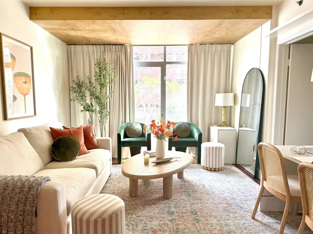 Sophisticated and serene, this private and quiet 4th-floor residence has been thoughtfully upgraded and features all-new LG appliances (Sept. 2024), including an induction range, refrigerator with ice maker and filtered water, microwave, quiet dishwasher, and in-unit washer and dryer—all included. Additional updates include a new garbage disposal (2026), hardwood flooring in the main living areas, travertine bedroom flooring, fresh paint, custom ceiling details, built-in shelving, light dimmers, blackout drapes, air conditioning, and a custom Elfa closet system with lighting. The upgraded kitchen showcases modern cabinet hardware, trash pull-out, and contemporary lighting, while the bathroom offers new fixtures, a large modern mirror, shelving, luxury filtered shower head, and dimmer lighting. Acqua Vista delivers resort-style amenities including valet parking, rooftop pool and spa, fitness center, BBQs, fire tables, EV charging, Amazon lockers, bike storage, full-time security, 24-hour concierge, and an on-site HOA manager, with additional parking available. Steps from the Little Italy Farmers Market, top-rated dining, and the waterfront, this home is ideal as a primary residence, second home, or investment opportunity.