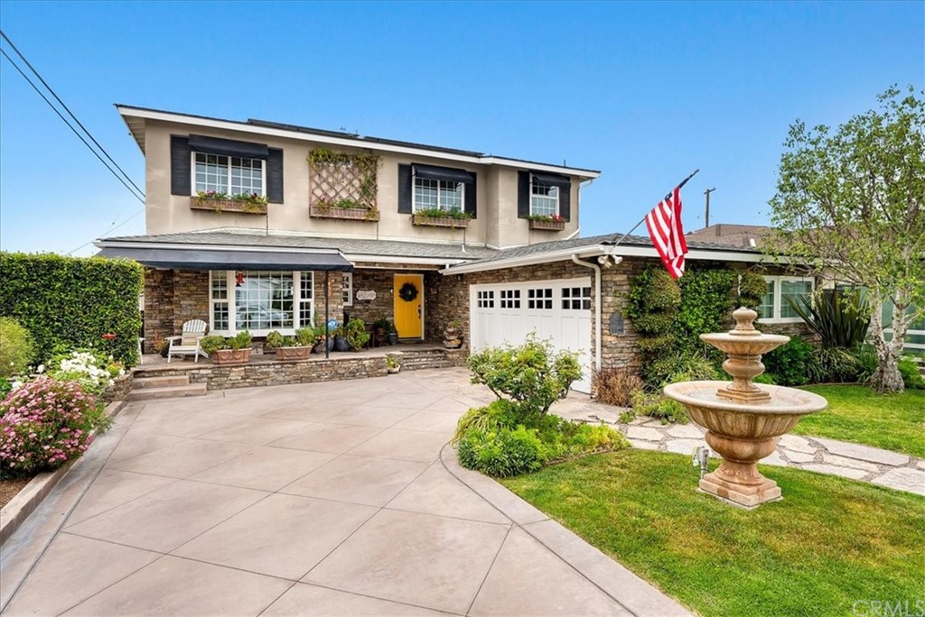 Prestigious Hollywood Riviera 2-story view home on a super quiet one block-long street with hardly any traffic!. Remodeled 5 + den (or 6 bedroom), 4-bath home with 2,856 sf on a flat 5,881’ lot. Covered front entry with sitting area with beautiful stone. Living room and dining area enjoy a large brick fireplace and open to the yard/view/patio via French doors. Custom designed and built kitchen features a giant butcher-block island with seating, quartz counters, true custom cabinetry, and stainless steel appliances. Direct access to the garage and laundry through the kitchen. Two large bedrooms on entry level including front bedroom (currently used as a den) with large bay window. Spacious second bedroom has a 12-ft closet & opens to the backyard and patio. Second level includes a huge main bedroom suite with ocean/sunset views, deck access via sliding door, fireplace and walk-in closet – plus – private bathroom with twin sinks, tile floors, granite surfaces and pebble-bottom shower stall. Three additional bedrooms upstairs share an upgraded hall bathroom. All bedrooms have large closets. Backyard has ocean views, turf yard area and a super large trellis-covered patio. Nice flower beds and sunny west-facing exposure with ocean, coastline and city light views! Large side yard perfect for relaxing in the shade. Completely remodeled home includes newer A/C and roof, dual-paned windows and sliders, and hardwood floors throughout. 2 story ocean view home just minutes from the beach and Riviera Village and award winning schools!