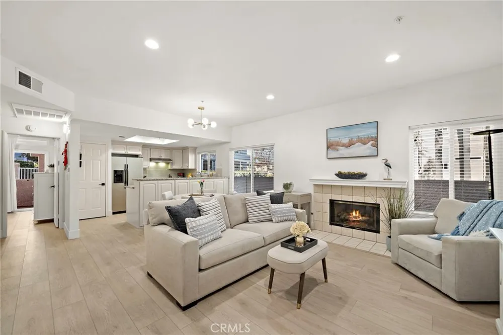 Resort-style living awaits in this luxurious beach-close ground-level end unit located within the gated community of Seaport I, adjacent to Huntington Harbour with its beaches, marina, and scenic wetlands, and just a short stroll to Trader Joe’s, popular restaurants, and shopping. This fabulous 2-bedroom, 2-bath condo delivers the ultimate coastal lifestyle with a beautifully upgraded open-concept design throughout. Notable features include central A/C, new wide-plank waterproof wood-vinyl flooring, extensive LED recessed lighting, dual-pane windows, custom blinds, raised-panel interior and closet doors, and high baseboards. From the moment you enter, you are welcomed by an elegant ambiance highlighted by a spacious living room with a gas-log fireplace and creamy tile surround, seamlessly flowing into the dining area and remodeled kitchen. The kitchen showcases granite countertops, stainless steel appliances, deep stainless sinks, and custom light-colored self-closing cabinetry with hidden trash and specialty storage, all complemented by serene greenbelt views. Both bathrooms have been tastefully remodeled, including a hall bath with travertine flooring, custom granite vanity with glass vessel sink, and tub/shower with travertine surround and mosaic inlay. The extra-large primary suite features wall-to-wall closets and a stunning all-white ensuite bath with porcelain tile flooring, quartz vanity, designer lighting, and a walk-in shower with sitting bench and frameless glass enclosure. A sliding glass door opens to a very private covered patio, perfect for enjoying refreshing ocean breezes. Additional highlights include an inside laundry closet for a stackable washer and dryer, an organized storage closet off the living room, and two assigned parking spaces in the subterranean garage with elevator access. Residents enjoy resort-style amenities including a pool, spa, clubhouse, gym, and lush greenbelts, with association dues covering water, trash, internet and cable. Ideally located near award-winning schools and just a short drive to the beach, pier, and vibrant downtown Surf City.