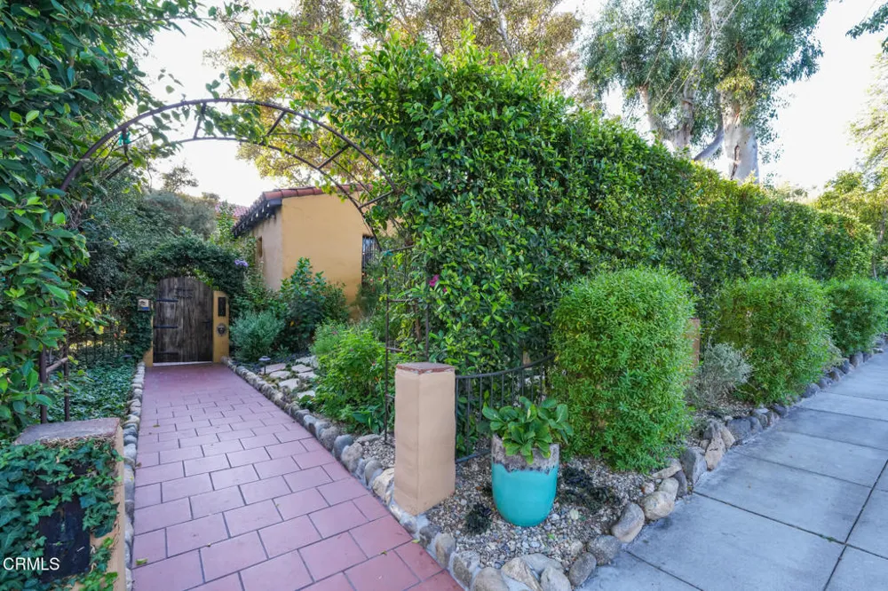 Known as the landmarked 'Adobe Eulalia Perez,' this 1924 Spanish Colonial Revival adobe is a rare, gated sanctuary in the heart of South Pasadena, offering extraordinary indoor-outdoor living and authentic architectural character. Hidden behind original walls and a secured entry, the home opens into a private courtyard setting that feels like a tucked-away European village, peaceful, romantic, and completely removed from the street.The main residence features a well appointed 1 bedroom and 1 bath with vaulted ceilings, original beams, details, and preserved period flooring, all carefully maintained and thoughtfully updated to honor the home's historic integrity while providing modern comforts. A beautiful galley-style kitchen serves as the heart of the home, offering refined counters, abundant character, and seating for up to four at the counter, flowing naturally to the dining area and a dramatic sunken living room anchored by a rejuvenated original fireplace.The covered courtyard, over 900 square feet, functions as a true extension of the living space, ideal for entertaining or quiet retreat. Highlights include an outdoor fireplace, Jacuzzi, lounge and dining areas, and a private outdoor shower, creating a resort-like atmosphere year-round.A separate guest quarters just off the courtyard provides exceptional flexibility, complete with a Murphy-bed sleeping area, kitchenette, dining nook, and bath, perfect for guests, an art or music studio, home office, or meditation space.A truly special offering for a single professional, young couple, or empty nesters seeking architectural significance, privacy, and proximity/walkability to the South Pasadena community, parks and schools.
