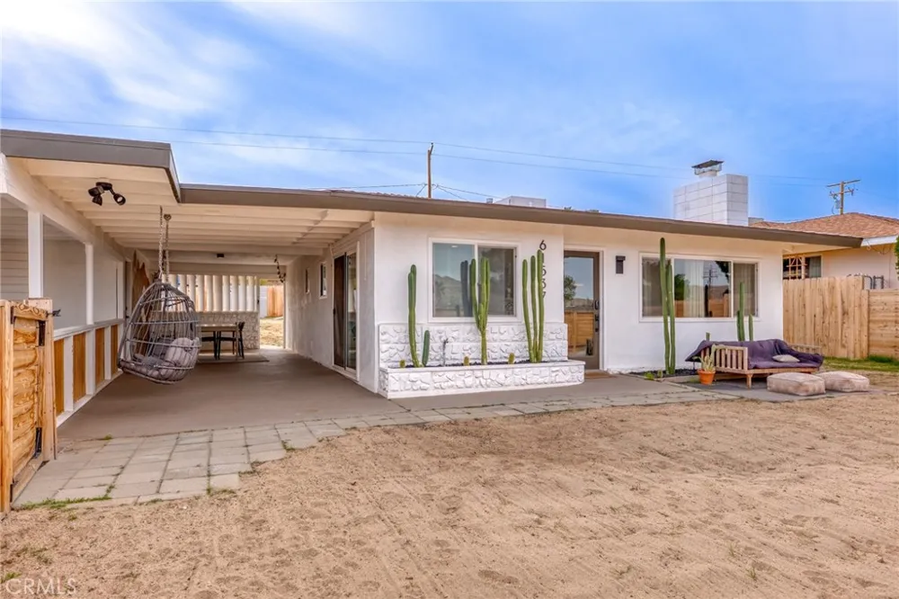Located in the heart of Joshua Tree Village, this beautifully updated midcentury modern home offers a seamless blend of iconic design and modern comfort, just minutes from Joshua Tree National Park, local galleries, shops, dining, and the vibrant Village scene. The main residence is a 2 bedroom, 1 bathroom home, with a detached bonus room currently utilized as a third bedroom and laundry space, offering flexible use as a guest suite, creative studio, or home office. The interior features a bright and inviting living room highlighted by a striking floor-to-ceiling stone-faced fireplace, enhanced by newer windows, recessed lighting, and clean concrete flooring throughout. Mini-split systems provide efficient heating and cooling year-round. The sleek, modern kitchen showcases white cabinetry, open upper shelving, and an open flow into the dining area, creating an ideal layout for everyday living and entertaining. Both bedrooms include recessed lighting and concrete floors and share a well-appointed bathroom with a walk-in glass-enclosed shower and single-sink vanity. Outdoor living is thoughtfully designed for enjoyment and functionality, featuring a covered patio with dedicated dining area, paver stone patio for seating, a cowboy pool with surrounding wood decking, and a putting green, all within a fully fenced backyard offering privacy and ease of maintenance. A carport provides convenient covered parking. With its prime Village location near hiking trails, art installations, music venues, and desert amenities, this property is well-suited as a full-time residence, weekend retreat, or potential short-term rental opportunity. A distinctive Joshua Tree offering that captures the essence of high-desert living with style and versatility.