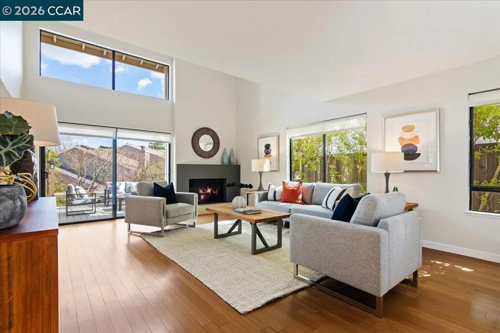 Welcome to your serene oasis in the Moraga Country Club! On a quiet cul-de-sac, this bright end unit townhouse offers 2 BR + a den along and 2,038 sqft of beautifully remodeled & expanded living space. As you step inside, you'll be greeted by elegant hardwood flooring that flows throughout the main areas. The dramatic vaulted ceiling in the living room and high windows fill the home with natural light and creating a warm and inviting atmosphere. The remodeled kitchen with premium Viking gas range, upgraded countertops and cabinetry flows into breakfast room and expanded family room/great room. This bonus room is right where you want it - off from the kitchen, not detached over the garage! Each bedroom includes its own en suite bathroom, while the balcony den/office offers versatile space for so many uses. The attached garage is equipped with a pull-down ladder for bonus storage providing plenty of space for all your belongings. Outside, enjoy the tranquility of a gated courtyard garden with a soothing water feature or unwind on the rear deck with creek-side views of the surrounding hills. You’ll have access to unlimited golf, tennis, swimming in 4 pools incl one just steps away, pickleball, fitness center, bocce, and two restaurants year-round while you vacation at home!