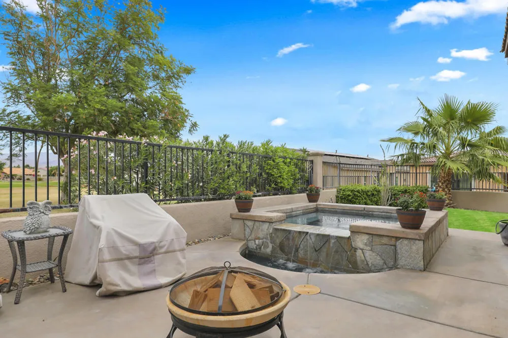 First look this Sat, Jan 24th 11-2pm. This well-appointed home featuring a flexible layout ideal for diverse living arrangements. It offers a spacious primary suite along with a junior suite that functions beautifully as a private guest space or comfortable in-law retreat. The interior opens to a bright, open living area featuring upgraded tile flooring throughout, slab granite countertops in the kitchen and bathrooms, recessed lighting, and a welcoming fireplace that adds warmth and character to the living room. Notable improvements include a newly installed heat pump furnace paired with a 4-ton air conditioning system, providing efficient climate control throughout the year. Updated ductwork and ventilation further enhance comfort within the primary suite. The kitchen has been updated with a new KitchenAid dishwasher, while an installed camera system adds an extra layer of security. Outdoor areas are equally inviting, highlighted by a charming front courtyard, an oversized side yard, and a private Pebble Tec spa complete with a calming waterfall and built-in barbecue--ideal for entertaining or quiet relaxation. Positioned on a corner lot, the property benefits from added privacy, a grassy area suitable for pets or play, and scenic mountain views. Residents enjoy low HOA dues and a low-maintenance lifestyle, with front and back yard gardening services included. Ownership also provides access to Indian Palms Country Club amenities, including pools, a fitness center, golf, tennis, pickleball, bocce, and a full-service restaurant. Please note that select photos have been virtually enhanced to reflect the home's appearance following seasonal lawn scalping. The rear exterior wrought-iron fence is currently being replaced. The Indian Palms golf course and clubhouse are under new management and undergoing a series of thoughtful upgrades. Homeowners have welcomed these improvements, which are enhancing both the social atmosphere and the resort-style lifestyle for which the community is known.